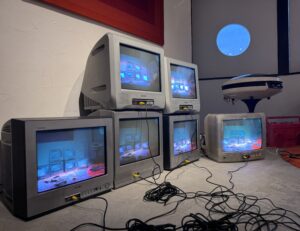 現状稼動していたスケルトンのTVに加えて主に1999年から2001年に生産されたRCA端子でビデオ入力が可能なブラウン管テレビ5台で合計6台が映像を映せるようになりました。